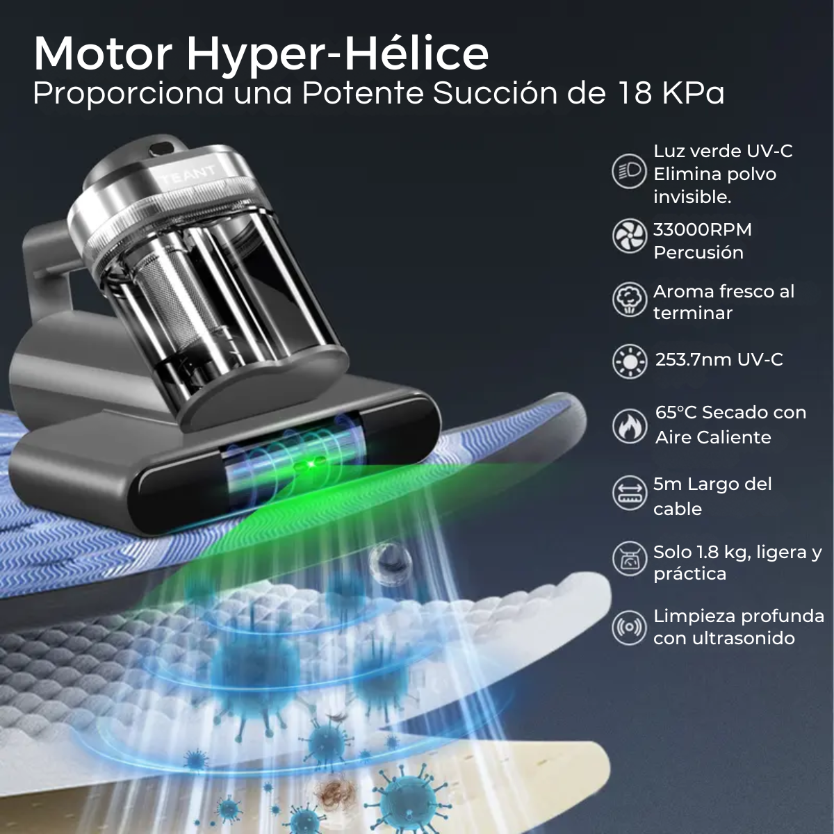 UltraClean no solo aspira el polvo visible: elimina ácaros, bacterias y alérgenos con su tecnología UV-C, vibración ultrasónica y succión de 18 KPa.