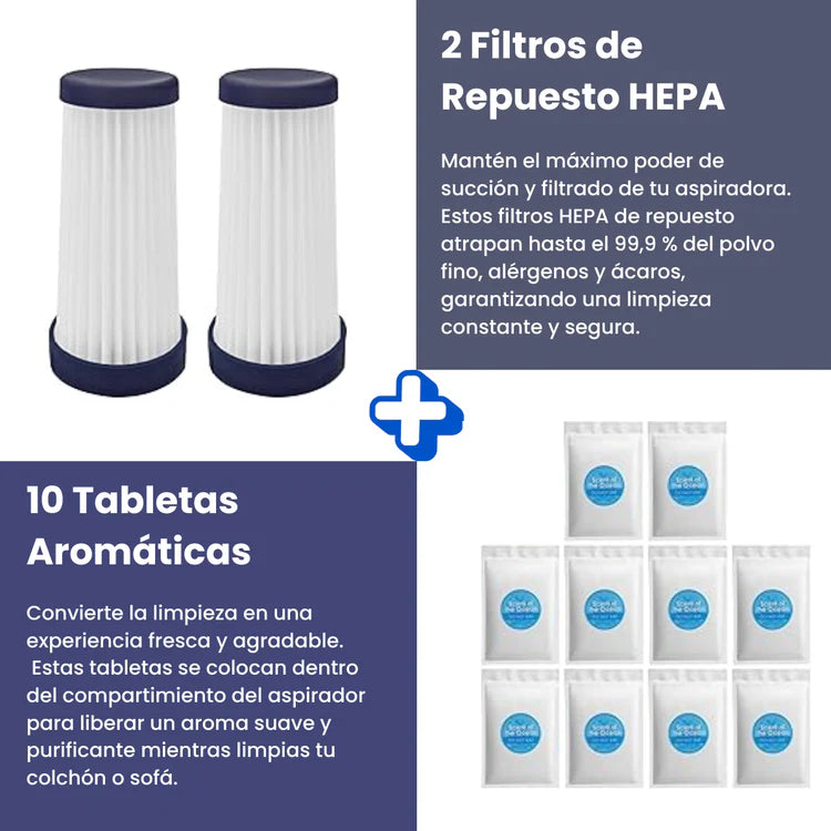 Disfrutá una limpieza más profunda y fresca sin pagar de más. Con tu aspiradora recibís 2 Filtros HEPA de repuesto para mantener la potencia al máximo y 10 Tabletas Aromáticas que dejan tu hogar con aroma a limpio cada vez que usás el equipo.