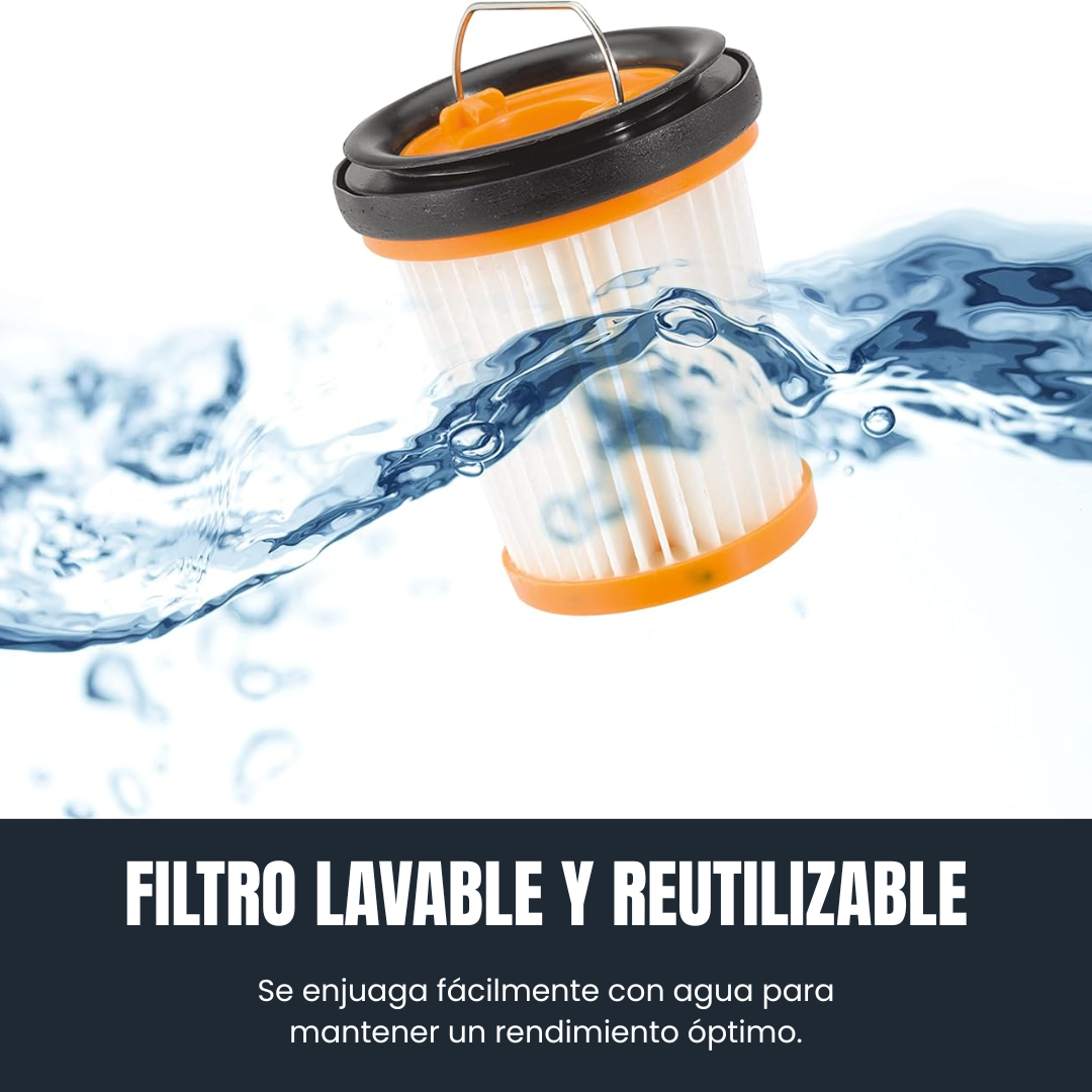 El filtro es lavable y reutilizable. Solo enjuágalo con agua, déjalo secar completamente y vuelve a colocarlo para mantener la potencia de succión.